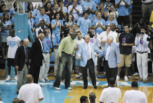 第二節(jié)結(jié)束后,1983年北卡NCAA冠軍隊(duì)主力喬丹站到球場(chǎng)中央,全場(chǎng)觀眾和他一起目視體育館上方的巨型錦旗揭幕。那上面繡著球隊(duì)2009年歷史上第5個(gè)NCAA桂冠,還有喬丹最新的一項(xiàng)個(gè)人榮譽(yù)——即將入選美國(guó)籃球名人堂。