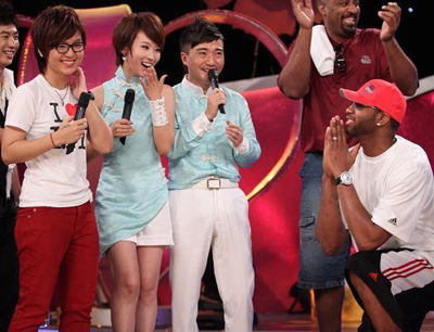 這不,在他結束中國行之前,安徽衛(wèi)視的一檔綜藝節(jié)目邀請麥迪和前超級女聲亞軍周筆暢一同參加節(jié)目,讓現(xiàn)場的觀眾大呼過癮。在節(jié)目現(xiàn)場,當?shù)弥矍斑@個較小的女孩竟然是中國的一位頗具實力的歌唱新星時,麥迪想盡一切辦法希望能聽到周筆暢的歌聲,包括表演了各種籃球技巧。當然,為了回饋麥迪,周筆暢當場獻上一曲《I Believe I Can Fly》。對于美國球員來說,這首歌是再熟悉不過的了,因為它幾乎是為籃球飛人邁克爾·喬丹量身定制的。麥迪十分欣賞周筆暢的歌聲,而且一邊聽還一邊不停揮舞雙手,連連稱贊道:“她有一副好嗓子,我祝福她今后可以發(fā)展得更好!” 之后,與麥迪同行的友人更是抱起周筆暢的腰將她托起來灌籃。這一舉動讓周筆暢大感意外,對著歌迷說:“這可是我人生第一個大灌籃!” 。