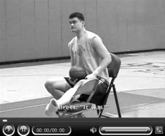 到達(dá)豐田中心之后,左腳打著石膏的姚明拄著拐杖坐上火箭的擺渡車,前往訓(xùn)練場(chǎng)。在訓(xùn)練場(chǎng)上,火箭隊(duì)球員主管布萊特·甘寧前來(lái)幫助姚明進(jìn)行投籃訓(xùn)練,而姚明坐在凳子上,打石膏的左腿架在椅子上,就以坐姿進(jìn)行投籃訓(xùn)練。