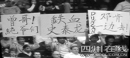 日前,火箭隊(duì)主場(chǎng)迎戰(zhàn)馬刺。雖然火箭以84:92脆敗,但現(xiàn)場(chǎng)球迷打出的標(biāo)語(yǔ)卻著實(shí)雷倒了不少人。據(jù)電視轉(zhuǎn)播的鏡頭顯示,現(xiàn)場(chǎng)有華裔球迷打出“曾哥純爺們”、“鐵血史泰龍”和“鄧肯一邊去”三條中文標(biāo)語(yǔ),看來(lái)“NBA全球化”的步伐還真是影響不小,只不過(guò)鄧肯或許會(huì)納悶:這曾哥是誰(shuí)?竟然比我還厲害。