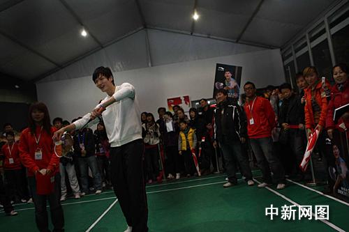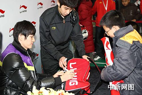 中新網(wǎng)上海十一月二十三日點(diǎn)(宗晨亮)日前,中國羽毛球名將鮑春來來到“2009李寧・中國羽毛球公開賽”球迷體驗(yàn)區(qū),和球迷們進(jìn)行了互動活動,還為大家簽名留念。有意思的是,小鮑的球迷多數(shù)都是女性,主持人也拿此事和他開玩笑。