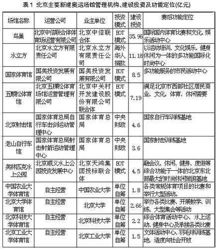 北京奧運場館建設(shè)積極借鑒發(fā)達國家的先進經(jīng)驗,采用BOT模式(指在大型體育場館的建設(shè)中引入民間資本進行建設(shè),場館建成后,政府允許其享有一定時期的經(jīng)營權(quán)及經(jīng)營收益,之后政府即無償收回經(jīng)營權(quán)),將場館建設(shè)與賽后利用有機地結(jié)合起來。北京12個新建奧運場館共投資83.69億元,其中業(yè)主自籌占50.46%,地方財政投資占25.51%,國家財政投資占10.67%,海外華人捐贈占13.35%(見表1)。一年來奧運場館的經(jīng)營業(yè)績證明這種模式是成功的,這無疑為今后我國大型體育場館的建設(shè)和賽后利用提供了可資借鑒的經(jīng)驗。