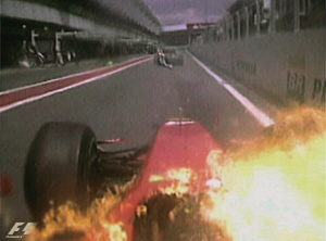 科瓦萊寧在進(jìn)站對賽車進(jìn)行修整后在加油管并未拔出的情況下便急匆匆駛離位置,硬生生將輸油管扯斷,導(dǎo)致燃油灑落在后面法拉利車隊(duì)的萊科寧車上,由于車體溫度很高,F(xiàn)60頓時起火,好在冰人立即擺頭將賽車駛離正路才避免更嚴(yán)重的事故發(fā)生,而科瓦萊寧在布朗GP車隊(duì)工作人員的幫助下才卸掉了被扯斷的輸油管。萊科寧回憶那驚險的一幕時說,MP4-24的美孚燃油進(jìn)入了他的眼睛。