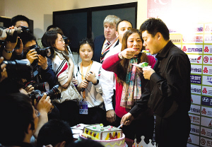 贏得了比賽,走進(jìn)新聞中心的丁俊暉非常開心,“今天比賽很精彩,打得還可以,上來(lái)就比較集中精力,今天比較動(dòng)腦子,一個(gè)機(jī)會(huì)得分,還能贏下比賽!边@時(shí)的丁俊暉完全不知道還有一個(gè)意外的驚喜在等著他。在簡(jiǎn)單回答了記者的幾個(gè)問題之后,賽事組委會(huì)的工作人員推上了一個(gè)臺(tái)球桌形狀的生日蛋糕,F(xiàn)場(chǎng)所有的記者和工作人員共同為丁俊暉唱響了生日歌,整個(gè)新聞中心變成了一個(gè)生日party!在所有人的祝福聲中,丁俊暉吹滅了生日蠟燭、切了蛋糕。