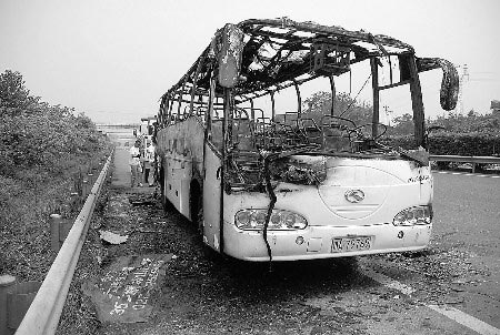 “當(dāng)時火勢確實比較猛烈!背啥枷懒嘘牭南狸爢T說,上午10時許接到報警后隨即趕到現(xiàn)場,整個客車幾乎被火包圍,30多名乘客站在據(jù)事發(fā)地200多米遠(yuǎn)的路邊,焦急地看著燃燒的客車卻無可奈何。消防隊員立即架起高壓水槍對著起火的客車掃射,不到5分鐘,火勢控制下來了。