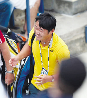 兩盤比賽,李娜沒有給對手任何機會,丈夫姜山在場下的表情逐漸變得豐富起來,不再是往常那樣的面無表情或者是淺淺的微笑,從他的臉上能看出明顯的情緒變化,滿臉的笑容能夠讓所有人感受到他的興奮。第二盤在自己的發(fā)球局里,李娜連得三分拿到三個賽點,并且在第一個賽點出現(xiàn)時就拿下比賽。李娜在賽場內(nèi)蹦了起來,姜山和托馬斯在場外也是一陣狂喜,姜山的眼睛瞇成了一條縫,嘴也快咧到耳根。跟往常一樣,姜山和托馬斯在比賽結(jié)束之后就背著球包離開。他和托馬斯一邊走一邊聊天,不斷有球迷從他們倆中間穿過,這絲毫沒有影響兩人的好心情,他們很興奮地一邊聊天一邊比劃著。姜山伸出食指指向天空,難道是已經(jīng)將目標(biāo)瞄準(zhǔn)了第一嗎?