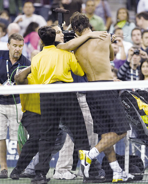 在9月8日納達爾戰(zhàn)勝法國選手蒙菲斯的比賽后,一名男子沖入場地并親吻了納達爾,他也因此遭到逮捕。