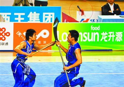 本以為昨天的兩次斷棍事故會(huì)給所有參賽隊(duì)敲響警鐘,但通過今晚的比賽來看,起碼廣西隊(duì)和已經(jīng)出現(xiàn)過一次事故的四川隊(duì)并沒有重視比賽器材的選擇和維護(hù)。在男子對(duì)練比賽中,廣西隊(duì)的黃俊華/黃杰第三個(gè)出場(chǎng),他們表演的項(xiàng)目是樸刀進(jìn)槍,也就是長(zhǎng)刀與長(zhǎng)槍的對(duì)抗。比賽進(jìn)行到了一半,黃俊華一刀砍向使槍的黃杰,長(zhǎng)槍抬起格擋時(shí)意外發(fā)生,長(zhǎng)槍的木桿與刀刃接觸后立刻斷為兩截,廣西隊(duì)本項(xiàng)比賽沒有獲得成績(jī)。