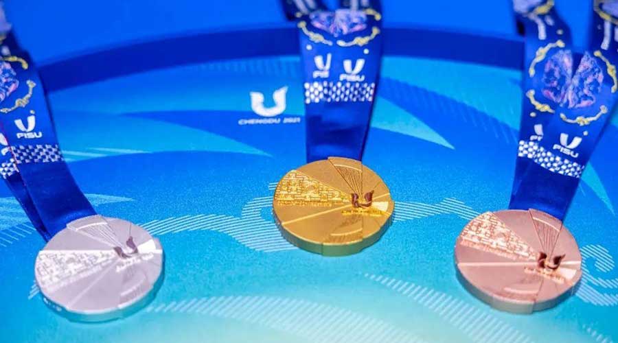 獎(jiǎng)牌形態(tài)呈現(xiàn)出不規(guī)則的圓形,以致敬太陽(yáng)與青春;獎(jiǎng)牌會(huì)徽面特設(shè)“文明時(shí)光墻”,刻畫(huà)了從象形文字“蜀”到現(xiàn)代漢字“雄起”等不同時(shí)期的中國(guó)文字
