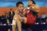 23日,亞運(yùn)摔跤比賽,中國(guó)選手高峰戰(zhàn)勝伊拉克選手獲得銅牌,賽后,高峰將在比賽中受傷的對(duì)手抱下場(chǎng)。