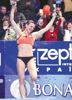 昨天,在烏克蘭頓涅茨克進(jìn)行的室內(nèi)田徑賽中,伊辛巴耶娃以4米95的成績打破女子室內(nèi)撐桿跳高世界紀(jì)錄。