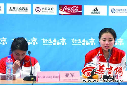 “你是國(guó)家隊(duì)目前年齡最大的選手,而你這次比賽三次失利都是難度最大的107B,是不是年齡大了對(duì)你完成難度大的動(dòng)作有些影響呢?”有記者問(wèn)。郭晶晶猶豫了一下說(shuō):“我真不知道怎么回答你的問(wèn)題。我覺(jué)得我今天整個(gè)表現(xiàn)挺好的。謝謝你啊!”比賽中得到銀牌的郭晶晶對(duì)隊(duì)友吳敏霞的比賽評(píng)價(jià)也很特殊:“她今天跳得特別好,簡(jiǎn)直神了。”隨后又說(shuō):“她在后面跳比較吃香。按理說(shuō)后面跳的壓力更大,但后面的裁判給的分?jǐn)?shù)會(huì)比前面好一些,因?yàn)槭亲詈笠粋(gè)嘛!
