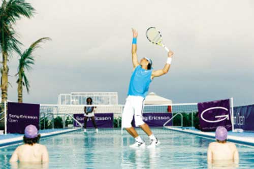 索尼愛立信公開賽即將大幕重開,網(wǎng)壇兩位巨星級人物納達(dá)爾和小威廉姆斯有幸親歷了一番別樣的打球體驗。本月24日,他們在邁阿密當(dāng)?shù)谿ansevoort South 酒店的屋頂上打了一場別樣的網(wǎng)球賽,更有意思的是他們“站”在水上打球。