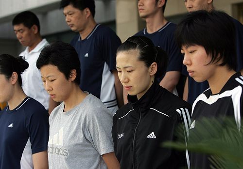下午14時許,全隊一反平日午休的習(xí)慣,匯集在基地體育賓館大堂,姑娘們都刻意回避穿著那套紅色的運(yùn)動服。14時25分,全體教練員、運(yùn)動員在國家排球運(yùn)動管理中心徐利主任的帶領(lǐng)下,在賓館外整齊列隊,徐利主任說:“根據(jù)國務(wù)院公告,為表達(dá)全國各族人民對四川汶川大地震遇難同胞的深切哀悼,中國女排隊為遇難者默哀!14時28分寧波北侖空襲警報聲劃破長空,體育賓館外的馬路上,汽車笛聲四起,女排姑娘們神色凝重,低頭為7天前的這個時刻遭受地震劫難的人們默哀。