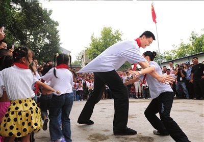 經(jīng)過了簡短的捐贈儀式,幾位小朋友上前邀請姚明與他們一道做游戲。在孩子帶領(lǐng)下,姚明緩緩地走入會場中間。剛開始還有些拘謹,這時小朋友們連忙拉著他的手,讓他彎下腰給他講解游戲規(guī)則!拔覀冇螒蚝芎唵尉褪抢销椬叫‰u。你可要當好‘雞媽媽’保護我們!”姚明俯下身子點了點頭,露出了會心的笑容。