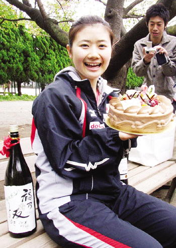 面對(duì)眾人送上的蛋糕,福原愛高興地接受了,但對(duì)來賓們“整蠱”似地送上的日本清酒,單純可愛的福原愛并不為所動(dòng),“雖然我出生在釀酒世家,但從小就對(duì)含有酒精的清酒味道相當(dāng)?shù)钟|。盡管作為一名成年人可以喝酒了,但我卻依然會(huì)堅(jiān)持滴酒不沾的原則,包括抽煙也一樣,絕對(duì)不會(huì)去碰!备T瓙鄣淖孑叾际轻劸频男屑依锸郑瑩(jù)說她的父親福原武彥更是酒量驚人。