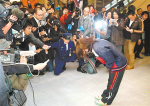 福原愛(ài)從機(jī)場(chǎng)走出之后,已經(jīng)沒(méi)有往日滿(mǎn)臉清純的笑靨,緊繃著臉在兩名空姐的保護(hù)下試圖殺出記者的重圍,面對(duì)記者:“你與錦織圭處朋友可順利?”、“彼此是否一直保持熱線聯(lián)系?”、“圣誕節(jié)是否會(huì)一起度過(guò)?”等諸如此類(lèi)的提問(wèn),福原愛(ài)都采取了拒不回答的態(tài)度,最終在記者們的強(qiáng)烈要求之下,福原愛(ài)才眼里噙著熱淚表示:“非常抱歉這件事給大家?guī)?lái)這么大的麻煩,我希望今后繼續(xù)努力把球打好,不辜負(fù)大家的一片期望!彪S后她也低頭向眾人道歉。