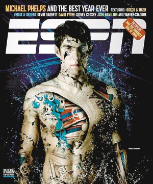 菲爾普斯憑借在北京奧運會中的曠世表現(xiàn),接連登上美國《體育畫報》和ESPN雜志封面。ESPN對飛魚圖片進行了十分“前衛(wèi)”的處理,赤裸上身的菲爾普斯纏滿花紋,酷似文身,看上去頗有幾分詭異。