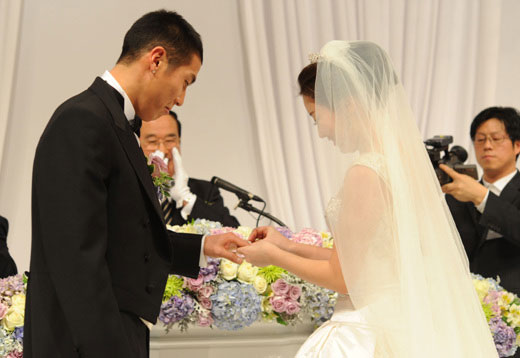 照片=韓聯(lián)社 2002年世界杯上的明星車斗理(左,德乙球隊(duì)TuS)于22日下午在首爾論峴洞皇宮飯店同申慧星(音,右)舉行了婚禮。申慧星是該酒店董事長(zhǎng)申喆昊的長(zhǎng)女。