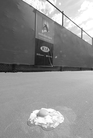 果然,昨天一大早,炙熱的陽光便烤得人們頭昏眼花,氣溫也很快躥升到40攝氏度以上,使得整個(gè)墨爾本像一個(gè)大火爐。據(jù)報(bào)道,墨爾本郊外的鐵軌在烈日暴曬下,部分已經(jīng)變形,火車因此延誤。有記者在賽場(chǎng)中央試著打了個(gè)雞蛋,沒想到雞蛋竟被煎熟了。