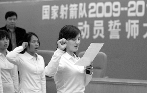 昨天下午,新一屆中國射箭隊在廣州黃村基地進(jìn)行了動員大會。在射運中心主任高志丹,副主任王義夫和總教練田渝陵的帶領(lǐng)下,北京奧運射箭金牌得主張娟娟代表運動員宣讀誓詞,射箭隊全隊面對國旗誓師。