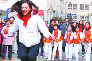 昨天,曾26次打破世界紀(jì)錄的俄羅斯撐桿跳運(yùn)動(dòng)員伊辛巴耶娃應(yīng)邀來(lái)到史家胡同小學(xué)分校,指導(dǎo)學(xué)生們撐桿跳的基本技能,并饒有興致地學(xué)起跳繩、抖空竹、滾鐵環(huán)等趣味體育活動(dòng)。