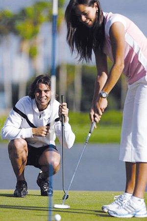 不過此組納達(dá)爾與伊萬的高球互動(dòng)組圖更有“曖昧”的味道。在果嶺上,納達(dá)爾隨時(shí)幫忙糾正伊萬的推桿動(dòng)作,而每次伊萬將球推進(jìn)后,納達(dá)爾更是給出鼓勵(lì),在果嶺上帥男靚女的傳情更讓人浮想聯(lián)翩,難道這兩人才是“戀人”?