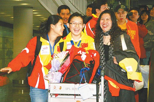 中國女子冰壺隊昨天在韓國奪得世錦賽冠軍的消息在國內(nèi)引起了轟動。今天下午,當她們從韓國飛抵北京首都機場后,數(shù)十名守候的記者把她們團團圍住,一向很少有人關(guān)注的中國冰壺姑娘面對大堆相機和話筒,感到受寵若驚,在賽場上以沉著冷靜著稱的隊長王冰玉,在這一刻也激動得說不出話來。