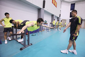在兩個(gè)多小時(shí)的體能訓(xùn)練中,陳豐的“招數(shù)”除了用語言調(diào)動(dòng)隊(duì)員的激情外,還不停地對訓(xùn)練內(nèi)容“花樣翻新”。每10分鐘左右,他就吹一聲哨子,抻拉肌肉換成慢跑、慢跑換成啞鈴、啞鈴換成杠鈴……