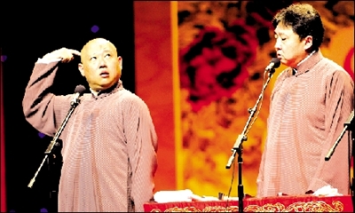 德云社的張德武、劉源以新編相聲《成長(zhǎng)的煩惱》開(kāi)場(chǎng),他們拿馬諾在《非誠(chéng)勿擾》中經(jīng)典的“寧愿坐在寶馬車(chē)?yán)锟,也不坐在自行?chē)后面笑”砸掛,現(xiàn)場(chǎng)效果很好。郭德綱、于謙登臺(tái)合說(shuō)了《夸住宅》,干脆利落的貫口贏得陣陣喝彩。走下臺(tái)的郭德綱說(shuō),搭檔于謙給了他不少驚喜,很多臨時(shí)發(fā)揮的話接得很到位。