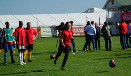 這次親臨南非賽場(chǎng),對(duì)于章子怡來(lái)說(shuō)是個(gè)難得的機(jī)遇,而且有幸與她喜歡的昔日球星合影作為永遠(yuǎn)的留念。她說(shuō):“我今年作為特奧大使受邀來(lái)到南非。這一次,特奧會(huì)舉辦了‘團(tuán)結(jié)杯’比賽,希望通過(guò)足球這項(xiàng)大家都熱愛(ài)的運(yùn)動(dòng),讓更多人了解智障這個(gè)群體!彼宰鳛樘貖W大使,她必須要真槍真刀地上賽場(chǎng),參加“揭幕戰(zhàn)”比賽!拔宜闶莻(gè)球迷,很喜歡看球,只是近幾年拍戲不太有時(shí)間看了。這次來(lái)南非要上場(chǎng)踢球還是我人生第一次,我只能勉強(qiáng)算個(gè)入門(mén)級(jí)‘球員’吧!,章子怡說(shuō),所幸的是與前亞洲足球先生中田英壽、NBA球星迪坎貝·穆托姆博、法國(guó)前國(guó)家隊(duì)隊(duì)員克里斯蒂安·卡倫布等結(jié)為隊(duì)友,“以前是在電視上有距離地看這些球星在球場(chǎng)上大展雄風(fēng),這次竟然與他們?cè)谝粋(gè)綠茵場(chǎng)上踢球,我覺(jué)得真的難以想象”。這些球星們很敬業(yè),當(dāng)看到章子怡動(dòng)作不夠標(biāo)準(zhǔn)的時(shí)候,會(huì)友善地給她示范,“我非常激動(dòng)能在賽場(chǎng)與他們相遇,正好合影留個(gè)念”。
