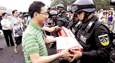 昨天下午,李瑞英、朱軍、郎永淳等中央電視臺(tái)和北京電視臺(tái)的十多位名嘴,為正在執(zhí)勤的特警隊(duì)員和交警,送去酸梅湯等夏季消暑飲品。近日,市公安局巡特警總隊(duì),在長(zhǎng)安街沿線及重點(diǎn)地區(qū)加強(qiáng)了巡邏防控和武裝震懾。據(jù)了解,特警們每人每天身上的槍支、防彈衣等裝備,需要負(fù)重?cái)?shù)十公斤!案邷乜崾睿鼐瘋冞著裝整齊,一站十多個(gè)小時(shí),他們確實(shí)是最值得尊重的!敝燔娬f。 記者 董世彪 郭曉樂 攝影報(bào)道