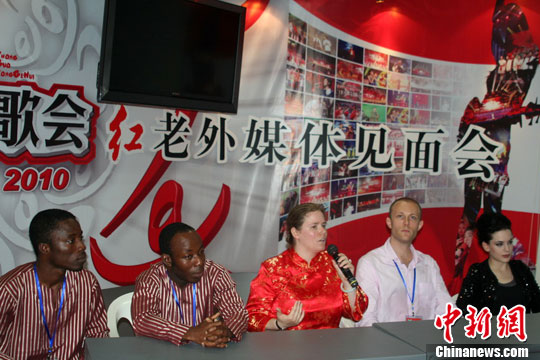 中新網(wǎng)南昌7月10日電(劉占昆)2010中國(guó)紅歌會(huì)突圍戰(zhàn)即將全面打響,10日下午,闖進(jìn)全國(guó)120強(qiáng)選手中的五位老外率先亮相在媒體見(jiàn)面會(huì)上,他們不僅現(xiàn)場(chǎng)唱起紅歌,還相互調(diào)侃耍寶。