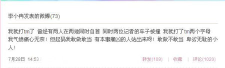 最近福建兩位記者因揭露“紫金礦業(yè)”,結(jié)果在同一天兩位記者的車子同時被撞。李小冉尤其關(guān)注這則新聞,她在昨日中午的微博中發(fā)飆:“天災就夠叫人無奈的了,人禍也是沒完沒了!彼 在微博中爆粗口,引來粉絲圍觀,認為其有損形象。
