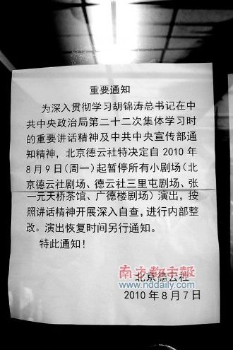 7日凌晨,德云社在其官網(wǎng)德云相聲網(wǎng)上發(fā)表聲明,表示從9日起將停止所有小劇場(chǎng)演出,“北京德云社特決定自2010年8月9日(周一)起暫停所有小劇場(chǎng)的常規(guī)演出,進(jìn)行內(nèi)部整改。具體的演出恢復(fù)時(shí)間,將根據(jù)實(shí)際情況另行通知。特此通告!甭暶鱾鞒,南都記者第一時(shí)間和德云社副總經(jīng)理王海取得了聯(lián)系,電話(huà)中,王海拒絕對(duì)此事發(fā)表任何評(píng)論,只是表示“演出近期內(nèi)都不會(huì)恢復(fù)”。