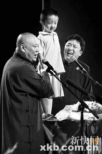 整場演出持續(xù)了近4個(gè)小時(shí),全場笑聲、掌聲、喝彩聲不停,觀眾都說這次壓軸出演的老郭很“給力”。被要求返場后,郭德綱竟然把云字輩最小徒弟、于謙的兒子抱上桌子,用巧克力引誘他唱曲。結(jié)果小家伙上來就自選了一段《我是一個(gè)兵》,老郭又借著表示誰侵略我們就給打過去,還和小家伙合唱了一句太平歌詞。