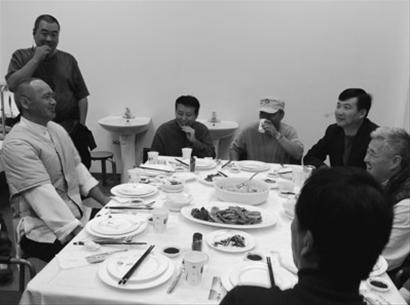 當(dāng)晚記者趕到片場(chǎng)時(shí),正好是各位大腕們中場(chǎng)休息就餐。也正趕上趙本山的朋友給他送來了一桌子菜,趙本山和老搭檔范偉、導(dǎo)演黃建新等人一起吃了起來,發(fā)哥也在工作人員的帶領(lǐng)下,到這桌來湊個(gè)熱鬧,和趙本山對(duì)桌而談。