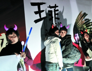 劉嘉玲曾在微博上發(fā)了一張?zhí)桨嗾,照片里排練中的王菲戴著一個(gè)“小牛角”裝飾,盡顯天后的童真可愛。而昨晚的女觀眾們有不少也在體育館門口買到了和王菲那個(gè)一樣的牛角裝飾戴在頭上。