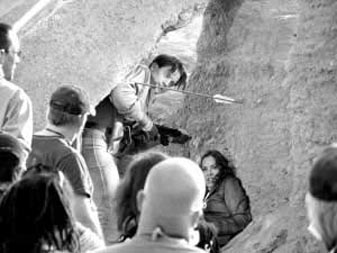 昨日(18日)拍攝的這場戲講的是布蘭登·弗雷澤與瑪麗亞·貝羅遭到敵人的追殺,二人在沙漠中一邊躲避弓箭的襲擊,一邊還擊,雕翎箭與短槍的交火頗有些“關(guān)公戰(zhàn)秦瓊”的味道。布蘭登扮演的里克一身牛仔裝扮,手拿一把短槍,依舊延續(xù)了前兩集中的扮相,而瑪麗亞扮演的艾芙琳則穿著深棕色短款?yuàn)A克,足蹬馬靴,手持一把手槍。導(dǎo)演羅伯·科恩一聲“開始”后,他們?cè)趲r石后緊張地躲避著敵人的追趕,此時(shí),一支雕翎箭射來,擦著布蘭登的右臂射進(jìn)土墻,布蘭登立即伏地掩護(hù)瑪麗亞,并迅速用槍還擊,而瑪麗亞也起身與他并肩作戰(zhàn)。盡管這個(gè)鏡頭在片中只出現(xiàn)短短的10秒鐘,但科恩導(dǎo)演還是讓兩位主演拍了3遍。