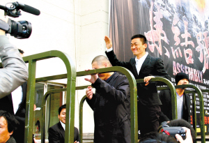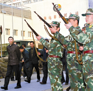 繼在北京舉行了盛大的首映禮之后,《集結(jié)號》主創(chuàng)一行十多人又馬不停蹄地來到上海展開宣傳活動。19日下午,新聞發(fā)布會選擇在上海電影集團5號攝影棚進行。在馮小剛帶領(lǐng)“谷子地”張涵予、廖凡、王寶強、任泉、袁文康、李乃文等主創(chuàng)入場時,武警戰(zhàn)士還鳴槍歡迎。整個發(fā)布會現(xiàn)場也布置成了片中硝煙彌漫的“戰(zhàn)場”,有沙袋、機槍、戰(zhàn)壕等。發(fā)布會后男主創(chuàng)們還乘敞篷吉普車和軍用卡車前往首映的電影院。