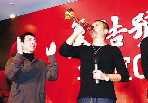 21日,是《集結(jié)號》上映“滿月”的日子,影片的出品方華誼兄弟在北京的一家會所大擺宴席,廣宴賓朋。這場“滿月席”慶祝的是《集結(jié)號》已經(jīng)獲得的2.35億的全國票房。席間馮小剛導(dǎo)演收到了未能到場的“趙二斗”鄧超送來的一把鍍金的集結(jié)號,馮導(dǎo)把號交到了連長的手上,“谷子地”于是鼓起腮幫子,吹響了讓他在片中等了幾十年終究沒有聽到的號聲……