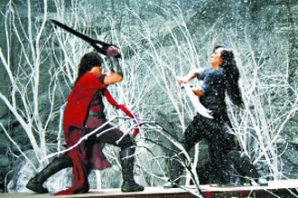 發(fā)布會當(dāng)天拍攝的是聶風(fēng)和步驚云的最后一場雪中決斗戲,這也是全片的一場重頭戲。在拍攝時還發(fā)生了一點(diǎn)“意外”,鄭伊健的劍不小心打到了郭富城的頭上,現(xiàn)場工作人員非常緊張,郭富城安慰大家說沒關(guān)系,沒流血,結(jié)果拍攝結(jié)束,郭富城摘掉假發(fā)后才發(fā)現(xiàn),被打到的地方竟然腫得老大,郭富城打趣道:“腫得像乒乓球,就當(dāng)迎接奧運(yùn)了!