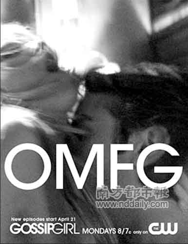 《緋聞女孩》是今年CW電視臺的新劇,由曾經(jīng)紅極一時(shí)的《橘子郡男孩》(TheO.C.)制作人打造,盡管收視率同樣不高,但是在全美掀起了新的時(shí)尚潮流。作為偶像劇,劇情并沒有特別的新意,但是該劇制作非常精良,從音樂到服飾,全部走在時(shí)尚最前沿,再加上光鮮亮麗的主演,在劇中盡情的談情說愛,十分養(yǎng)眼,在美國成為高中生追捧的話題劇集。經(jīng)過編劇罷工風(fēng)波,《GossipGirl》最近重返美國小屏幕,為了打響聲勢,CW電視網(wǎng)制作兩款海報(bào),引起不少爭議,其中一款以主角C和B的激吻為畫面,另一款主打S和N上床的激情戲,并打上“OMFG”的大字。