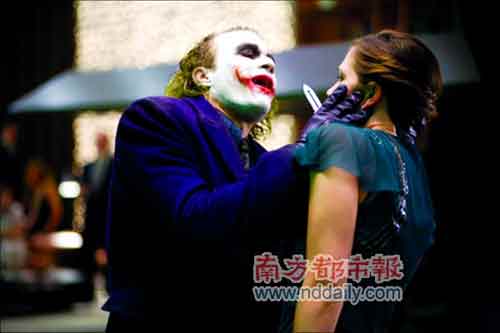 小丑一邊撥弄“英俊”的發(fā)型手拿小刀走向蝙蝠俠的女友,猥瑣地舔著舌頭打招呼:“你好美啊。你看上去有點(diǎn)緊張!憋@然,蝙蝠俠又遇到了一個(gè)很討厭的情敵。鏡頭一轉(zhuǎn),小丑終于和蝙蝠俠打上了。蝙蝠俠駕駛摩托戰(zhàn)車,小丑手持機(jī)關(guān)槍,在街頭單挑,一輛貨柜車被掀翻,爆炸,小丑囂張奸笑,瘋狂享受戰(zhàn)爭!厄饌b:黑暗騎士》將于7月18日北美上映。
