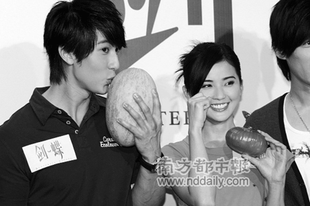 昨天下午,《劍蝶》劇組在北京舉行媒體答謝酒會(huì),導(dǎo)演馬楚成率阿SA、吳尊、胡歌等主創(chuàng)亮相!秳Φ芳磳⑶,答謝會(huì)也成了劇組人員的告別宴,劇組準(zhǔn)備了一筐蔬果做告別禮物,阿SA和吳尊給對(duì)方挑的禮物,讓人不禁啼笑皆非。