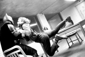 還是在審問期間,“蝙蝠俠”和“小丑”互相糾纏在一起,前者的雙手掐住了后者的頭頸。當(dāng)時采取了不同機(jī)位拍攝特寫,從一個角度來看,“小丑”從“蝙蝠俠”的手臂下方抓住他,但從另一個角度來看,“小丑”的手臂卻占據(jù)了上風(fēng),搭在“蝙蝠俠”手臂之上。