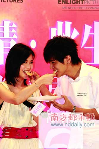 《歲月情》講述一個法國餐館大廚和一個少女之間的愛情故事,瞄準(zhǔn)明年情人節(jié)。片中羅志祥扮演法國大廚,為營造氣氛,主辦方特意安排了他和阿Sa互相喂食大蝦的環(huán)節(jié)(如圖)。