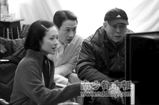 陳凱歌與章子怡、黎明在《梅蘭芳》拍攝現(xiàn)場(chǎng)。