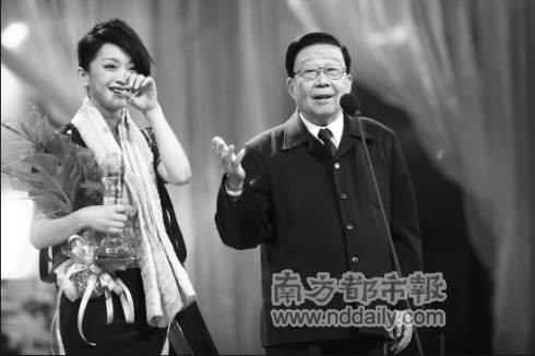 2008年度影視頒獎(jiǎng)盛典7日晚揭曉,周迅的恩師謝鐵驪導(dǎo)演親自為她頒獎(jiǎng),讓周迅不禁激動(dòng)落淚:“沒(méi)有謝導(dǎo)就沒(méi)有今天的我!(見(jiàn)上圖)當(dāng)宣布邀請(qǐng)謝鐵驪導(dǎo)演登臺(tái)頒獎(jiǎng)時(shí),原本在臺(tái)上的周迅立即沖下去,走到觀眾席親自攙扶謝導(dǎo)走上舞臺(tái)。18年前周迅在銀幕處女作《古墓荒齋》,正是出自謝鐵驪導(dǎo)演之手。此番再次會(huì)面,讓兩人都是感慨不已。