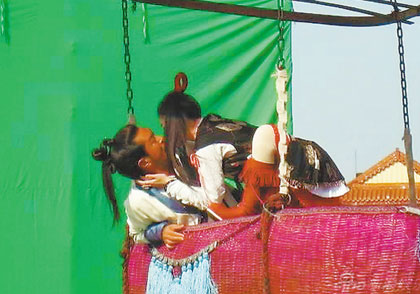 記者前往探班的一場(chǎng)戲,是該劇最后一幕:古天樂(lè)和大S經(jīng)歷種種波折終于走到了一起,在古天樂(lè)用風(fēng)箏和竹筐連成的“熱氣球”里度過(guò)浪漫時(shí)光。由于過(guò)于浪漫,大S演的俠女便起了“色心”,于是發(fā)生了強(qiáng)吻這一幕。